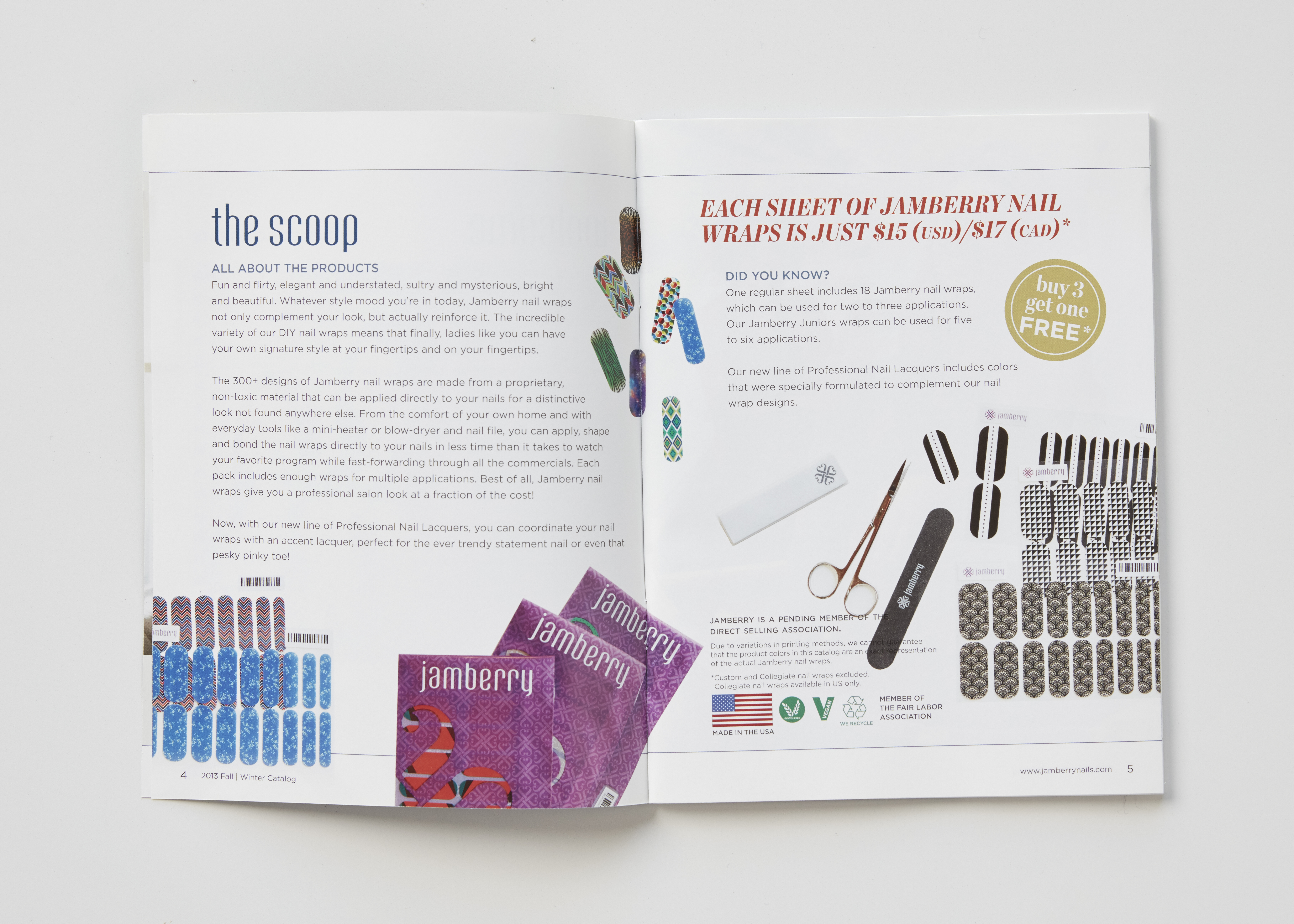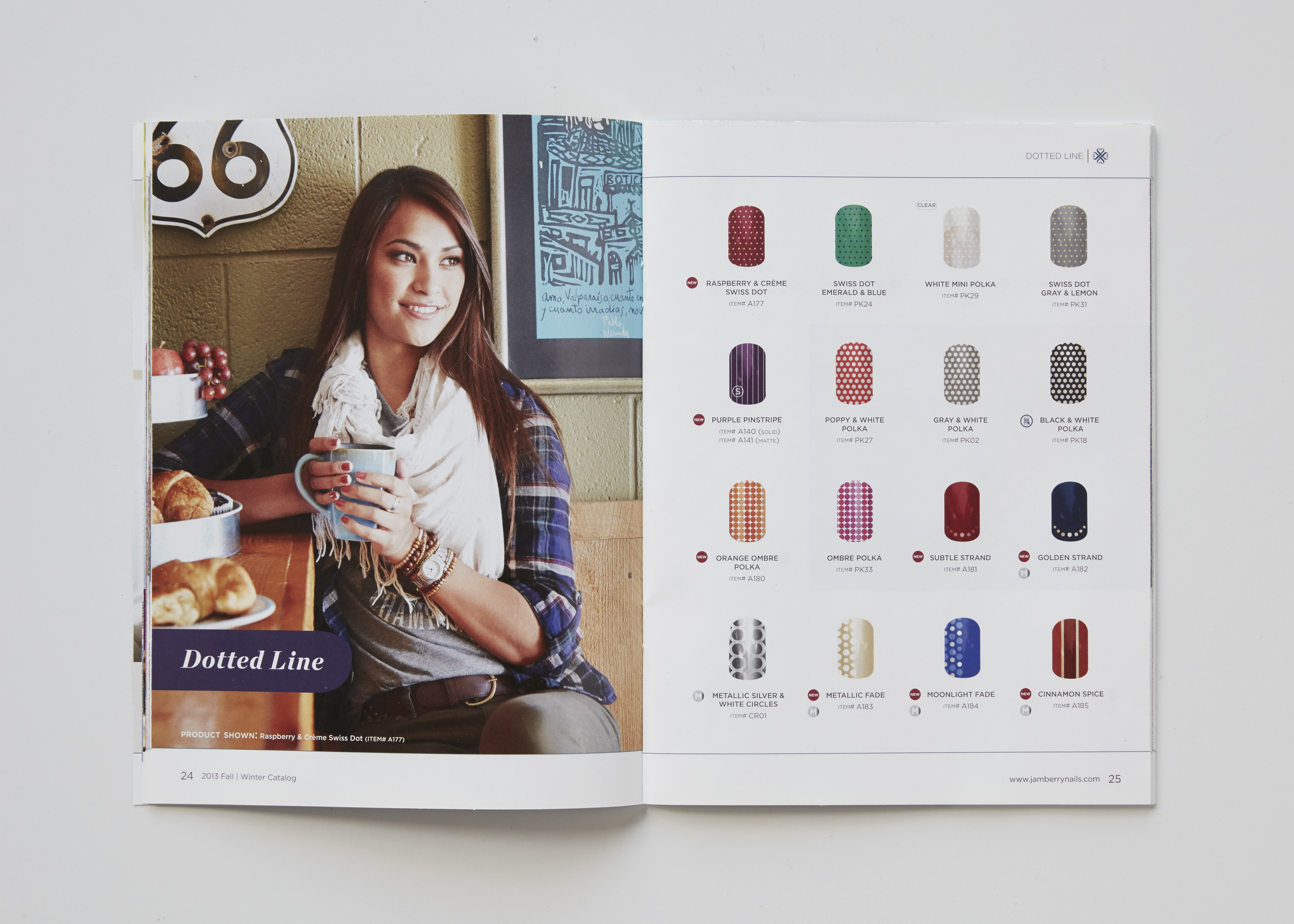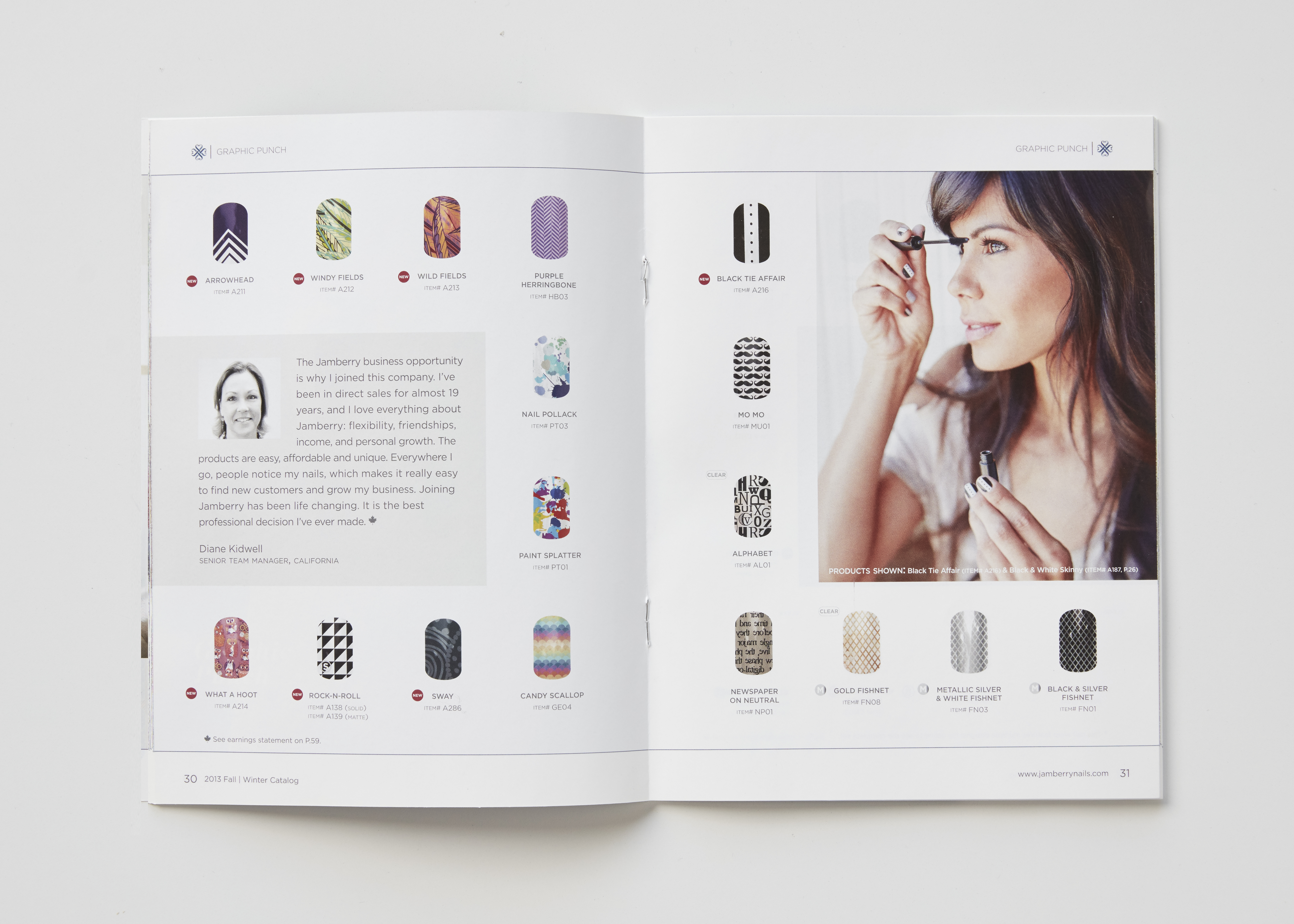 When I was hired by Jamberry Nails, it was a young, fast growing company. As their first ever Creative Director, it was my opportunity to develop not only a creative team, but to set the brand standard for the company as well. One of the first projects that I reconstructed was the Jamberry product catalog. I produced both their 2013 Spring/Summer and 2013 Fall/Winter Catalogs. Up to this point Jamberry had been utilizing stock photography. With the new catalogs I was able to hire professional models, make-up and clothing stylists, and a photographer to create images that were unique to Jamberry and reflected the Jamberry brand, setting them apart from their competitors. I also created a new layout for the catalogs, that showcased the product in a more user friendly, professional and sophisticated way.